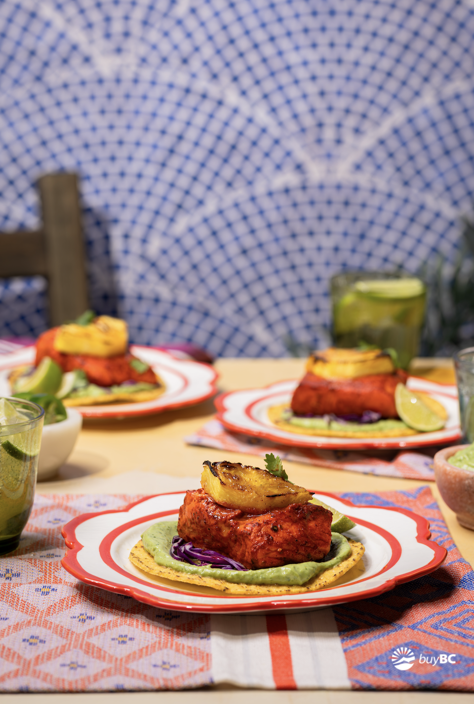 Spread a thin layer of avocado crema on each tostada shell followed by the halibut and pineapple. Top with a bit of shredded cabbage and garnish with a sprig of cilantro and lime wedges.