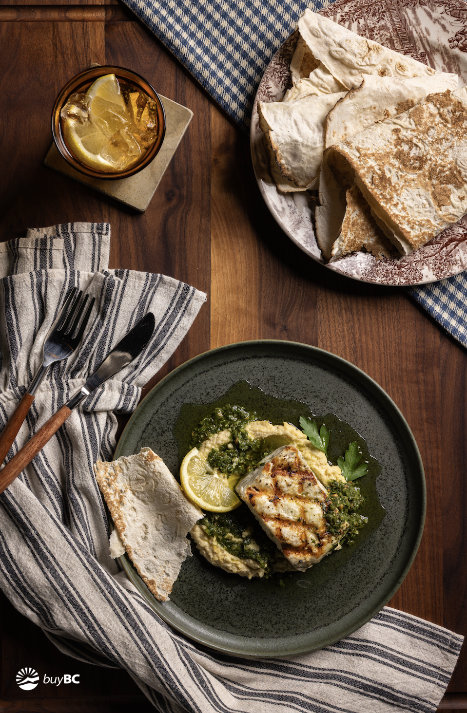 Plate the grilled halibut alongside celery root hummus, zhoug and warmed flatbread.