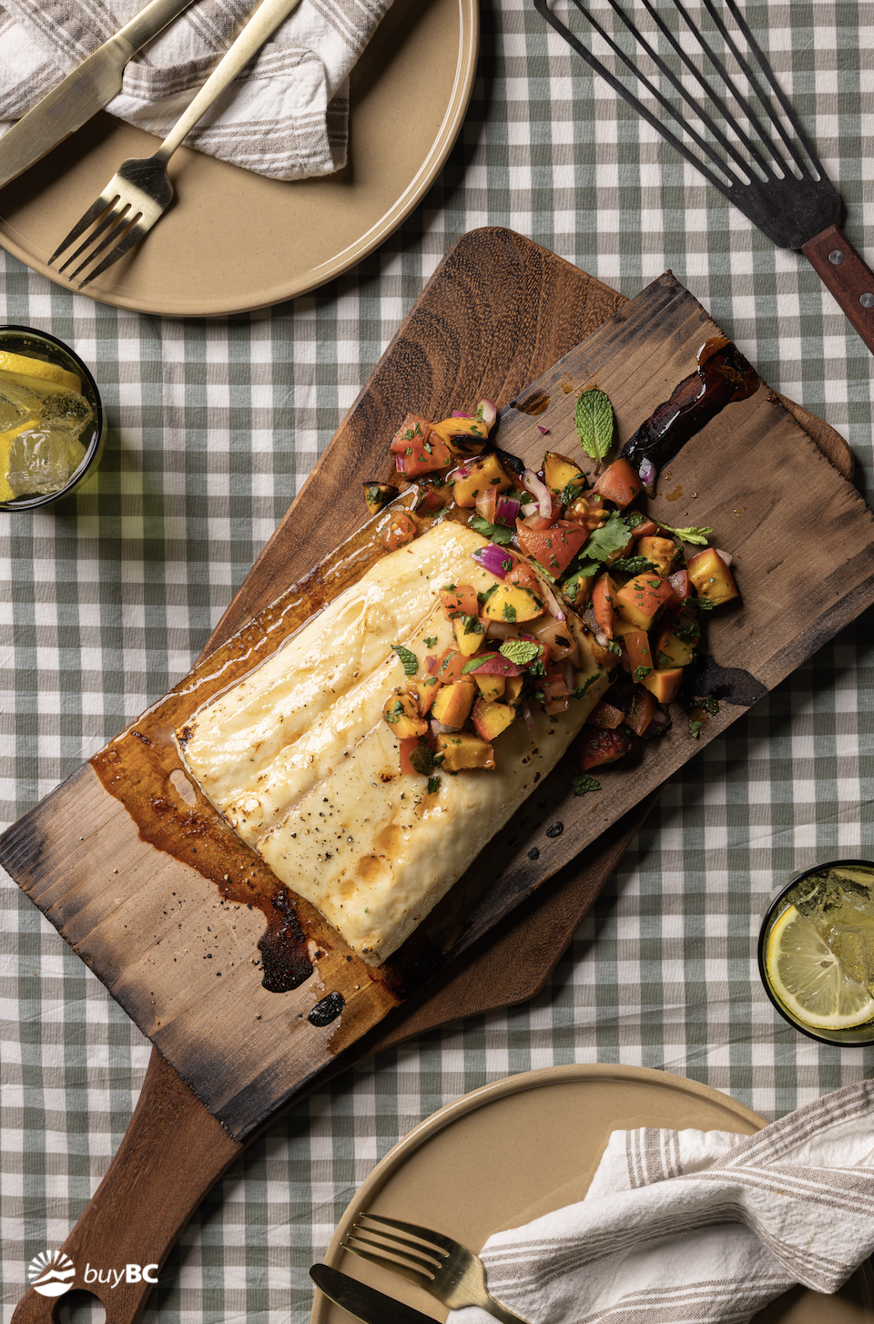 Honey-glazed cedar planked Halibut with grilled peach salsa