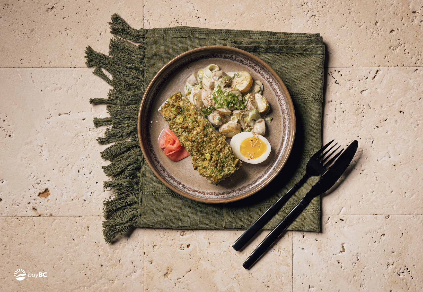 Wasabi Pea Crusted Halibut with Japanese Potato Salad and Jammy Eggs